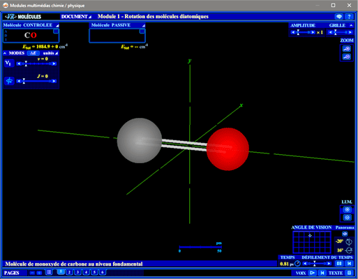 - Au bas, un lien VR Molécules Pro, qui ouvre dans la fenêtre d'animation la version Pro de la simulation, qui permet d'explorer librement la vibration et la rotation moléculaires. Cette version est aussi disponible en version autonome.