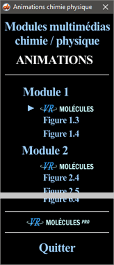 - Un lien VR Molécules, qui ouvre (si elle ne l'est pas déjà) la fenêtre d'animation et y affiche une présentation comprenant plusieurs pages. Celle-ci s'ouvre à la page 1 et des onglets au bas de la fenêtre d'animation permettent de changer de page.
